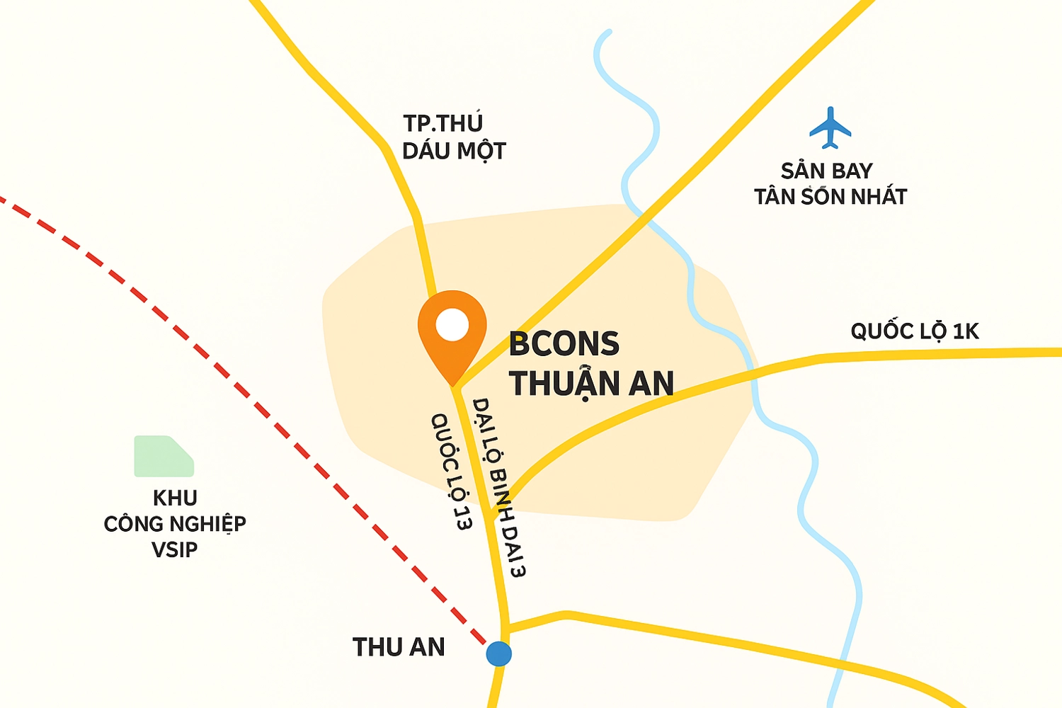 Vị trí căn hộ Bcons NewSky nằm toạ lạc trên mặt tiền đường Quốc lộ 13 – trục giao thương huyết mạch và lớn nhất kết nối các tỉnh thành kinh tế trong điểm của phía Nam. Quốc lộ 13 được ví như ” con đường tơ lụa” của khu vực phía Đông, khi là cửa ngõ kết nối thẳng tới trung tâm Thành phố Hồ Chí Minh. Đặc biệt, dự án Bcons QL13 còn nằm ở vị trí lõi trung tâm của Thành phố Thuận An cũ, thuộc khu dân cư giàu có – sầm uất – nhiều tiềm năng phát triển.