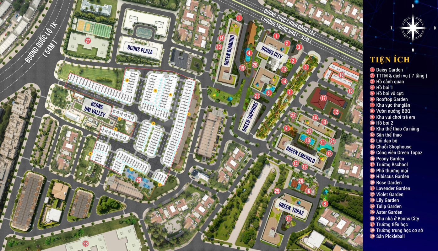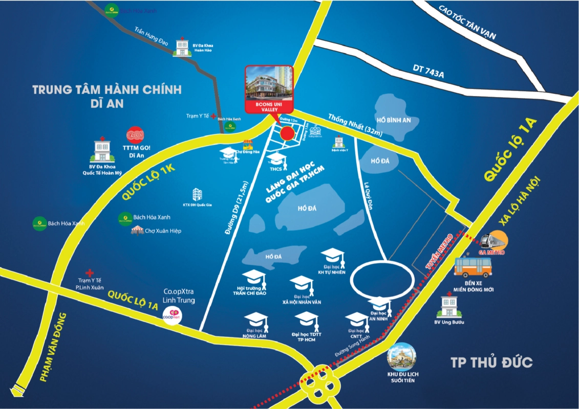Dự án nhà phố thương mại Bcons Uni Valley thuộc Quần thể Bcons City. Nằm tại phường Đông Hòa, Thành phố Dĩ An, tỉnh Bình Dương.